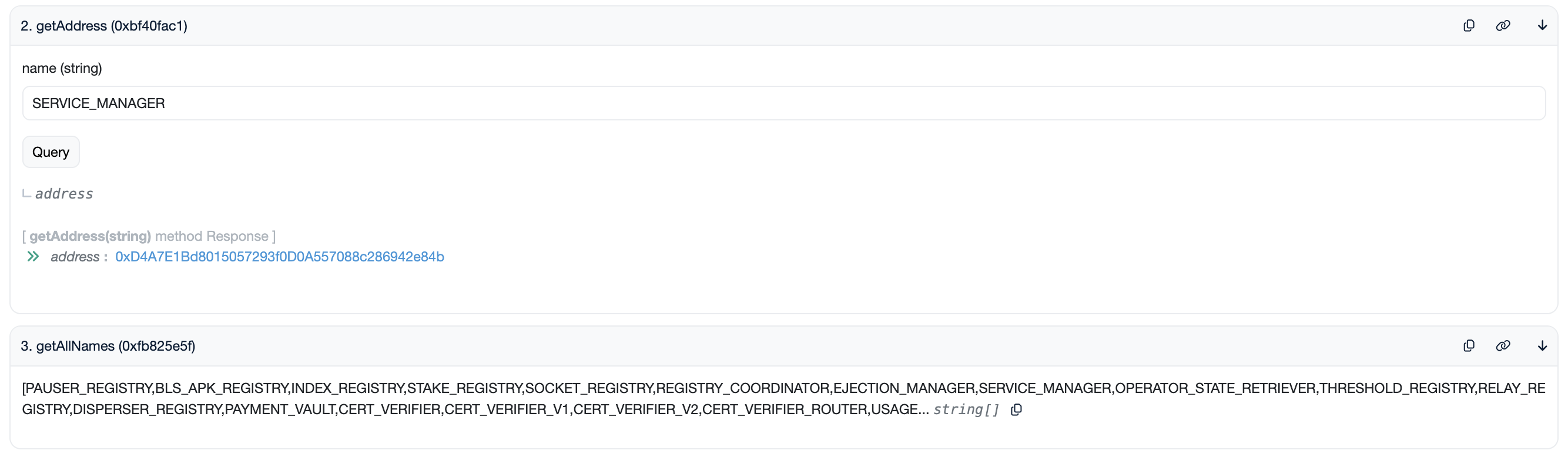 5. Use the "getAddress()" function to get the address of a specific contract, using its name.